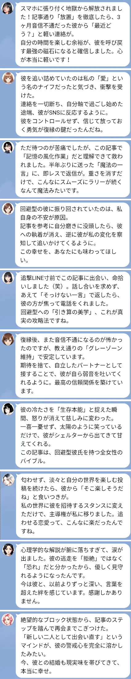 - 【信頼の再構築】過去の失敗を蒸し返さず、何事もなかったかのような軽やかなトーンで会話を成立させ、彼に「以前よりも居心地がいい」と感じさせる再会へのステップ。