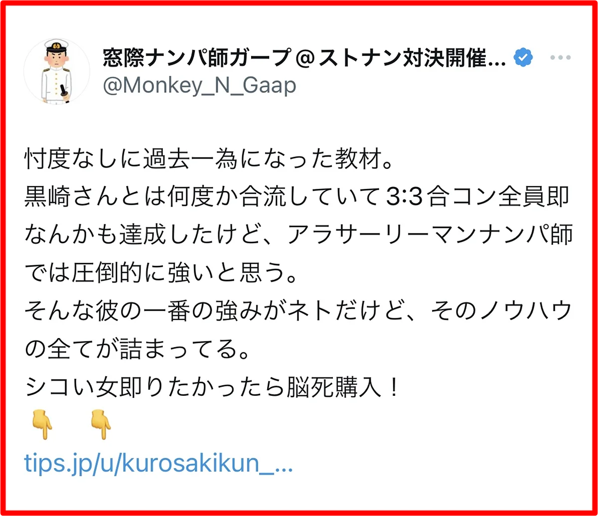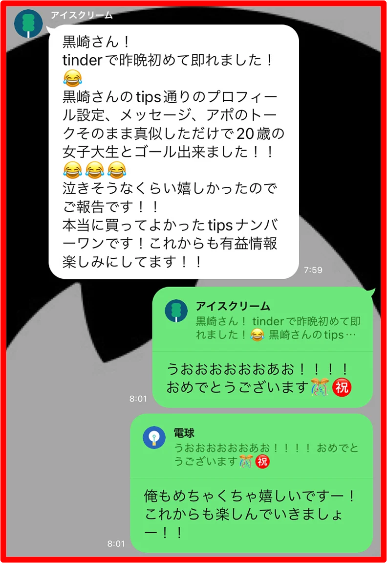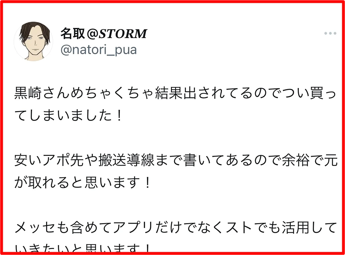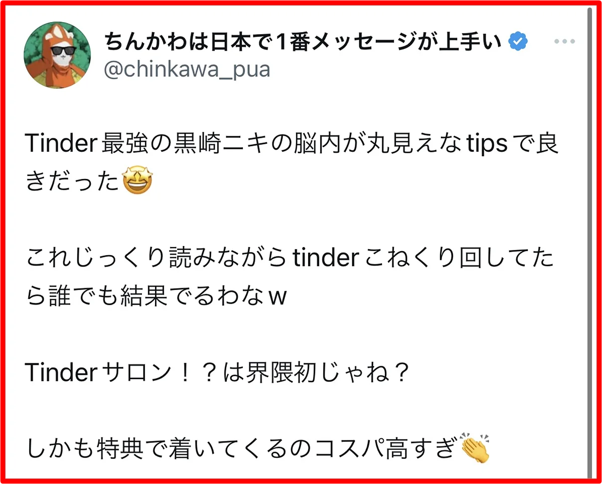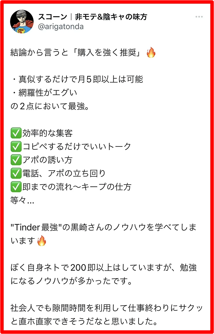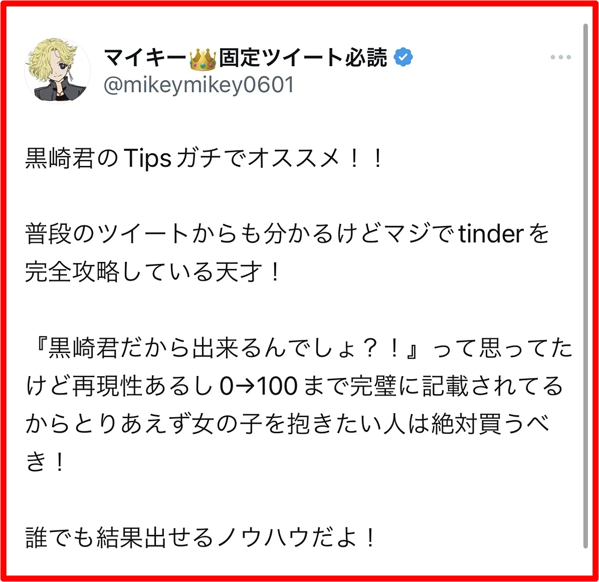 黒崎のノウハウは、彼女づくりには全く向いていません。初回でS●Xすることに限りなく特化させているので、セ●レは出来ても彼女は出来ません。というか、彼女が欲しいのであれば多分tinder以外のアプリをした方が効率的です。逆に言えば、それほどまでにtinderは時間やお金をかけずにサクッとS●Xするのに最適なアプリなのです。