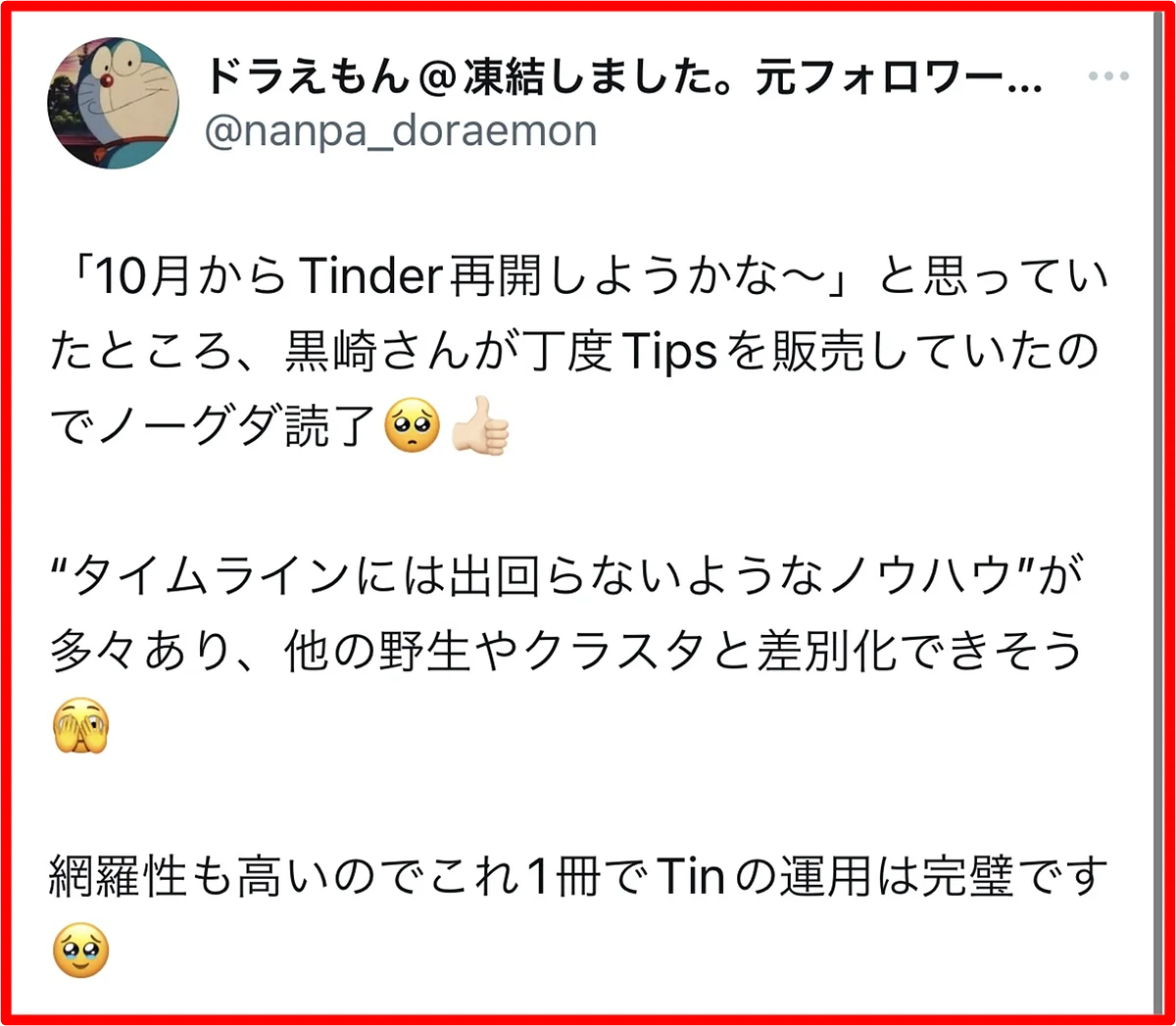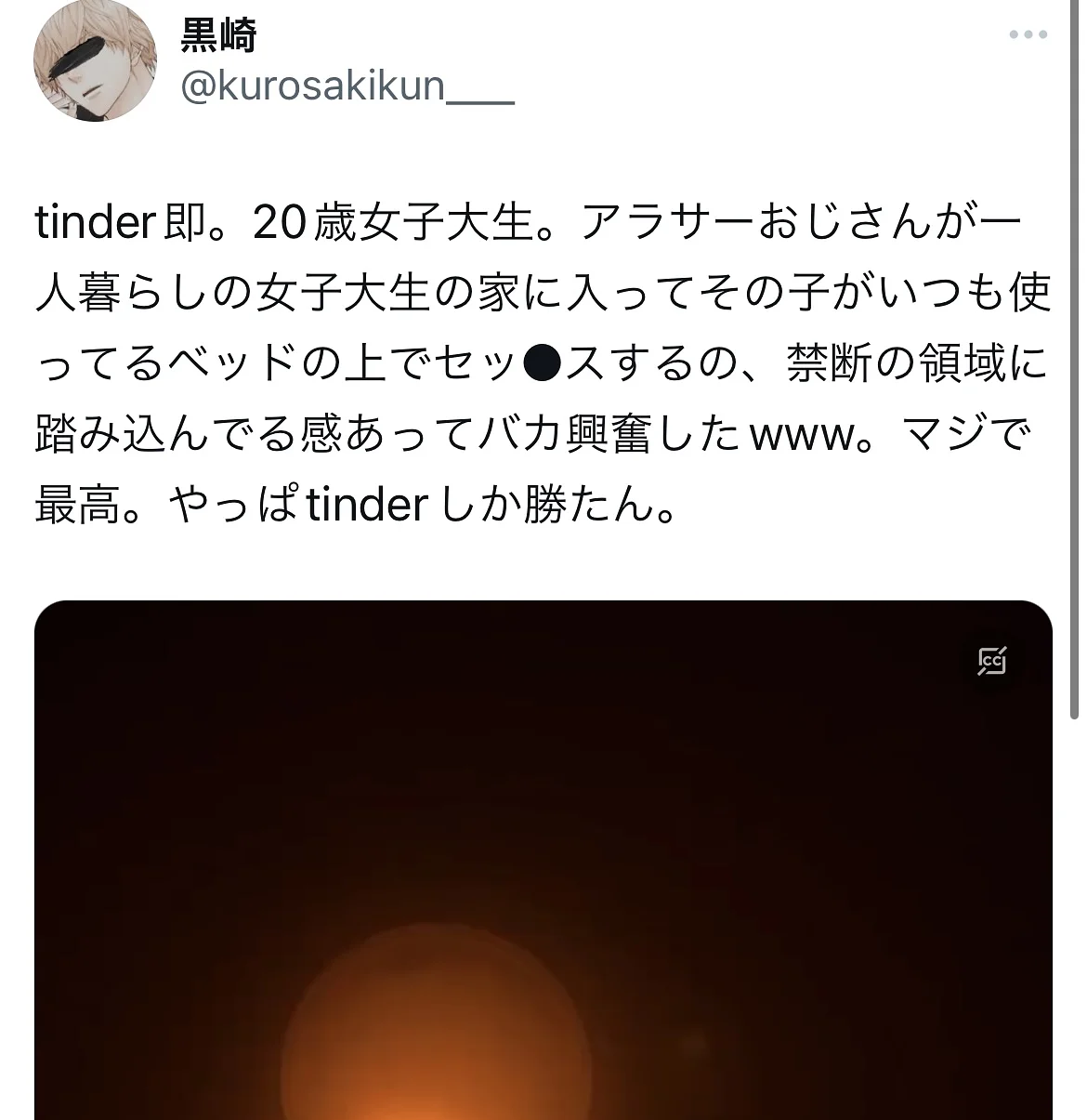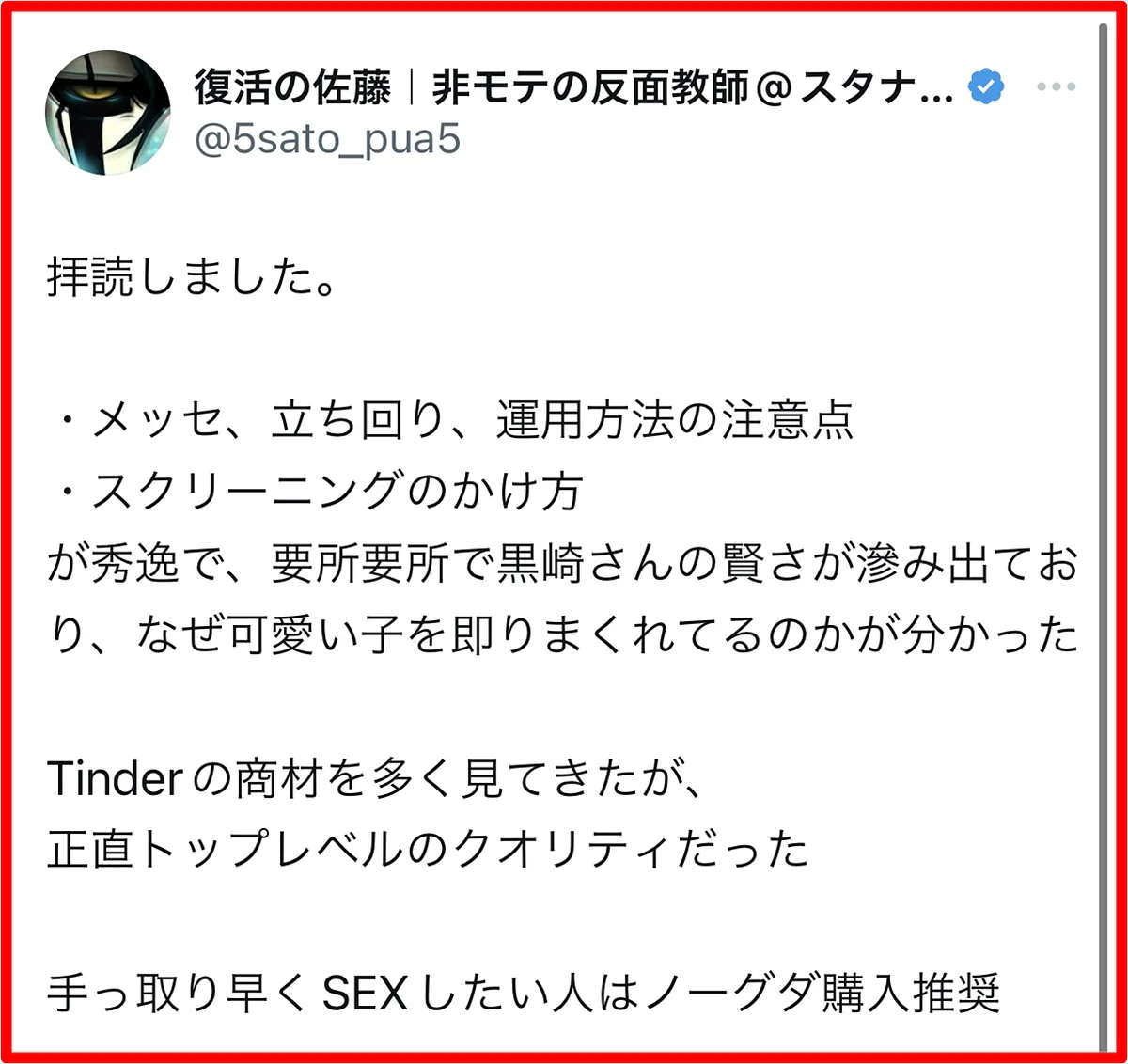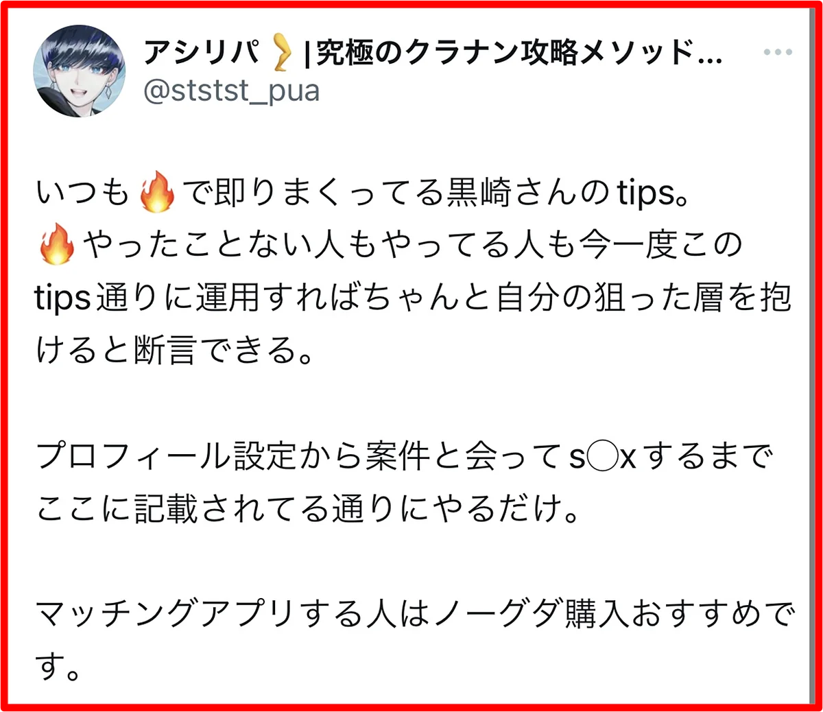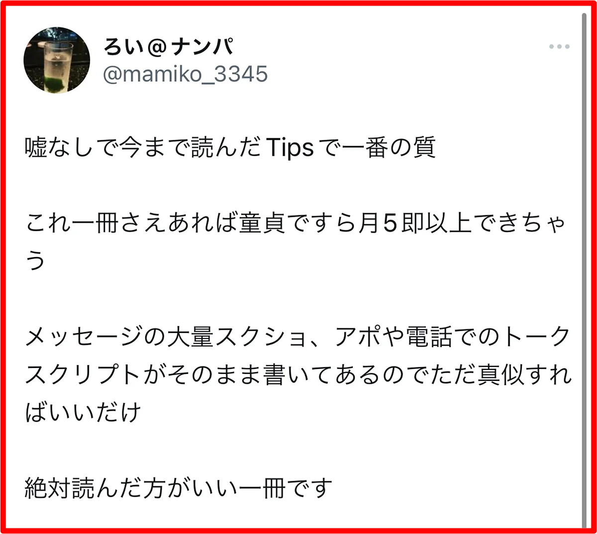 黒崎のノウハウは、彼女づくりには全く向いていません。初回でS●Xすることに限りなく特化させているので、セ●レは出来ても彼女は出来ません。というか、彼女が欲しいのであれば多分tinder以外のアプリをした方が効率的です。逆に言えば、それほどまでにtinderは時間やお金をかけずにサクッとS●Xするのに最適なアプリなのです。