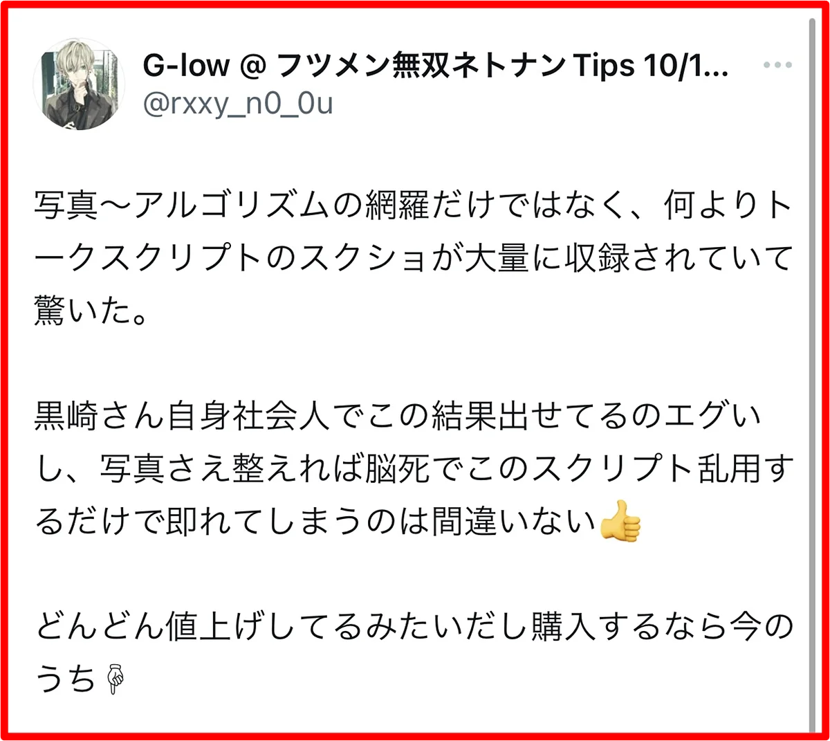 黒崎のメソッドを使えば特定の属性の女の子と狙ってマッチすることが出来ています。本書内で実例を公開してます👍